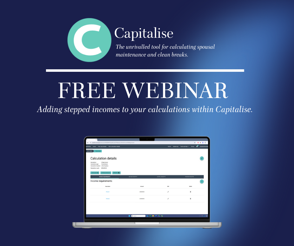 Watch our free webinar on how to create stepped incomes using Capitalise - our unrivalled tool for calculating spousal maintenance and clean breaks.
