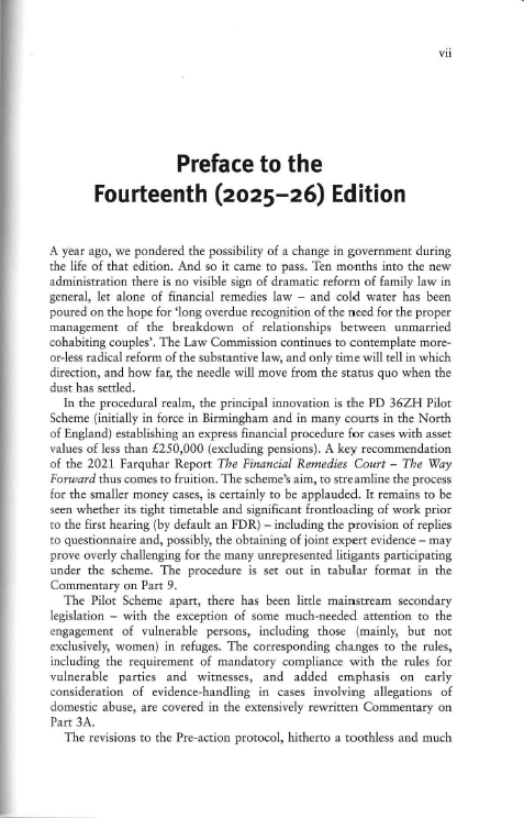 - The introduction in April 2025 of the express financial remedy procedure for smaller money cases being piloted in Birmingham and the North of England, summarised in tabular form in the commentary on Part 9.