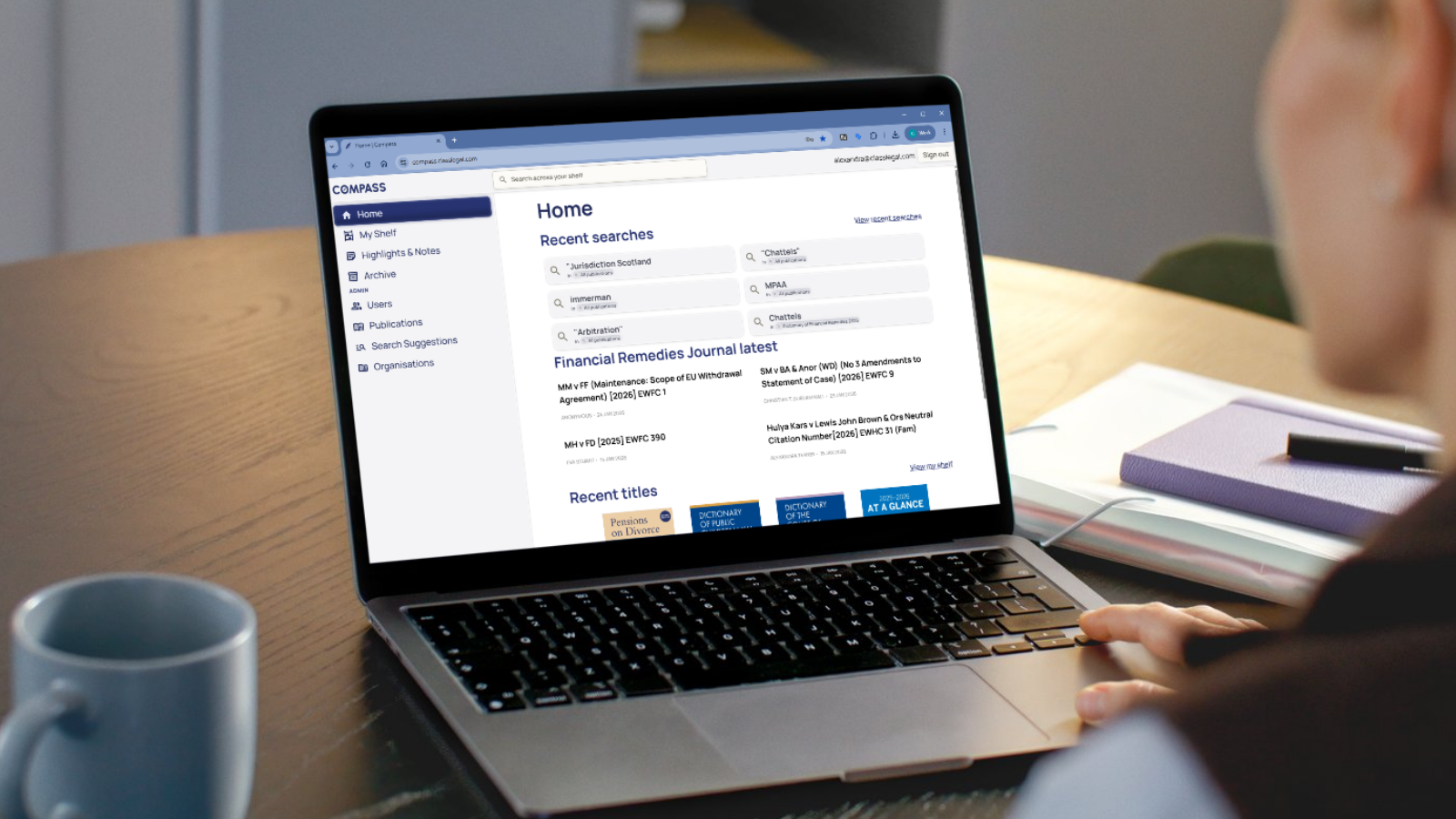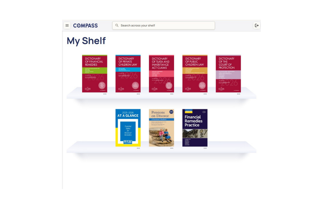 On your Compass dashboard you will find your recent searches, the latest content from the Financial Remedies Journal and all of the books on your shelf, as well as your recent highlights and notes. You can find all of your titles under the 'My Shelf' tab. Use the powerful search feature to explore your titles or make useful annotations on important paragraphs.