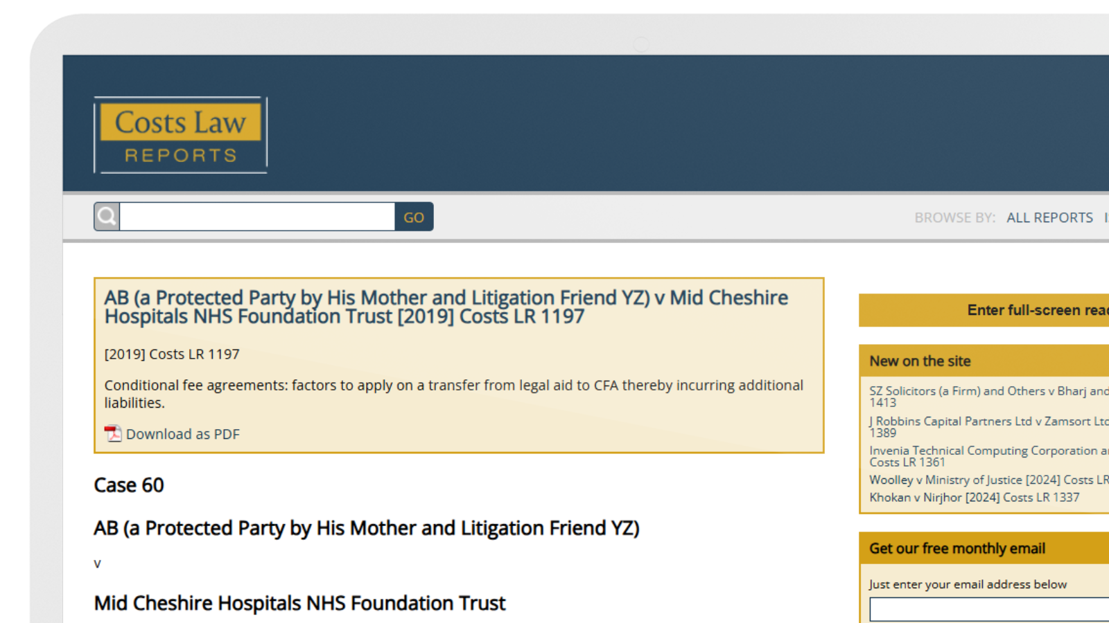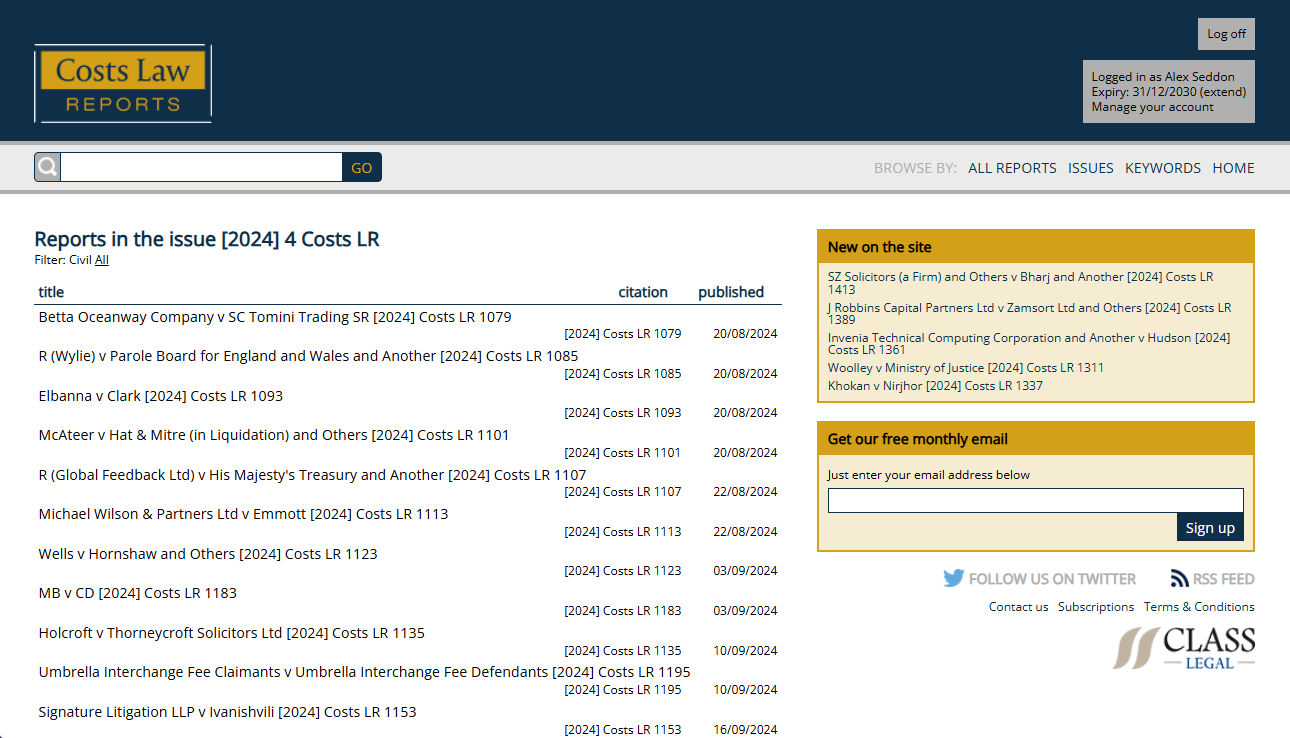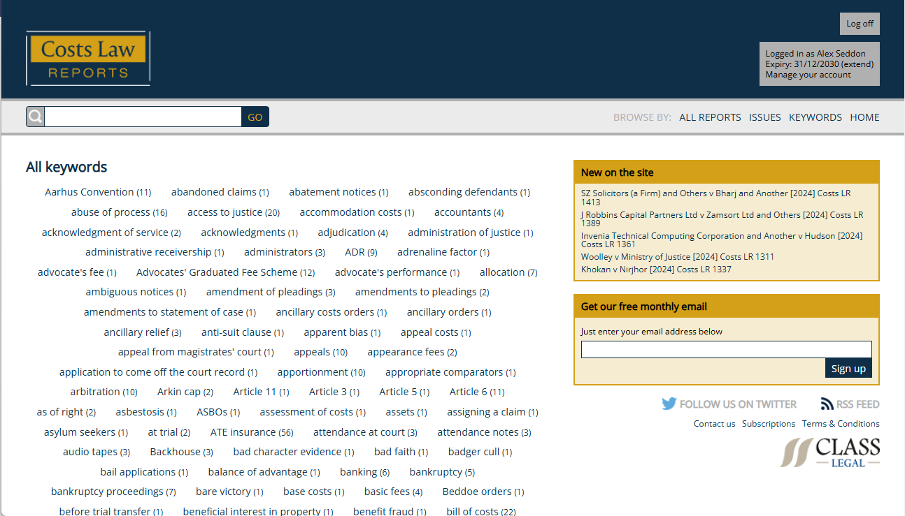 Costs Law Reports online is the biggest and most comprehensive online archive of Costs Law cases, both civil and criminal. There are over 1900 cases for members to access and download, all complete with a summarising headnote.